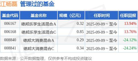 江杨磊先生:中国国籍,硕士,曾任职于尼尔森公司、伊顿公司、复星锐正资本、德邦证券产研中心及投资管理总部。2023年3月加入德邦基金管理有限公司,历任专户业务部投资经理、权益研究部执行总经理,负责科技板块研究。2025年9月9日担任德邦乐享生活混合型证券投资基金、德邦大消费混合型证券投资基金基金经理。